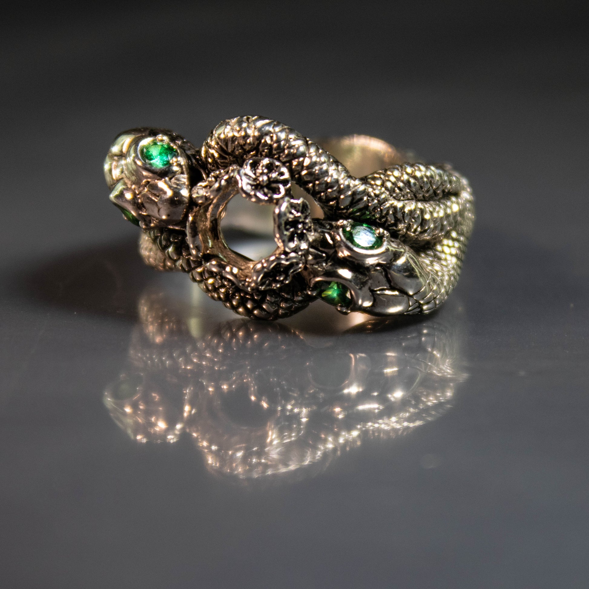 Details: Paul Badali, a life long fan of J.R.R. Tolkien, has created the Engagement Ring of Aragorn and Arwen in solid sterling silver. The ring features two snakes with emerald green cubic zirconia eyes entwined around your finger holding a sterling silver crown of flowers in their mouths.