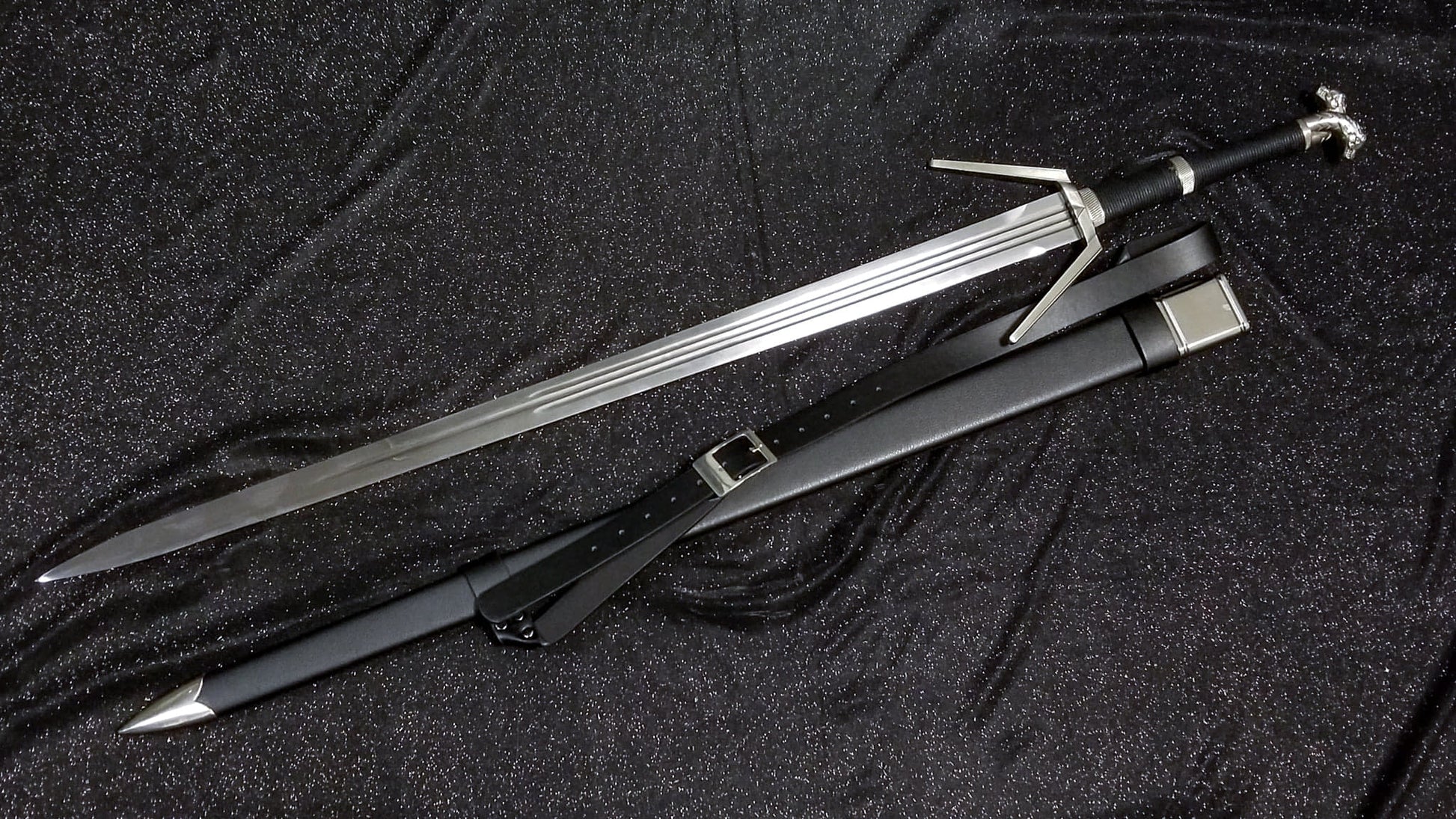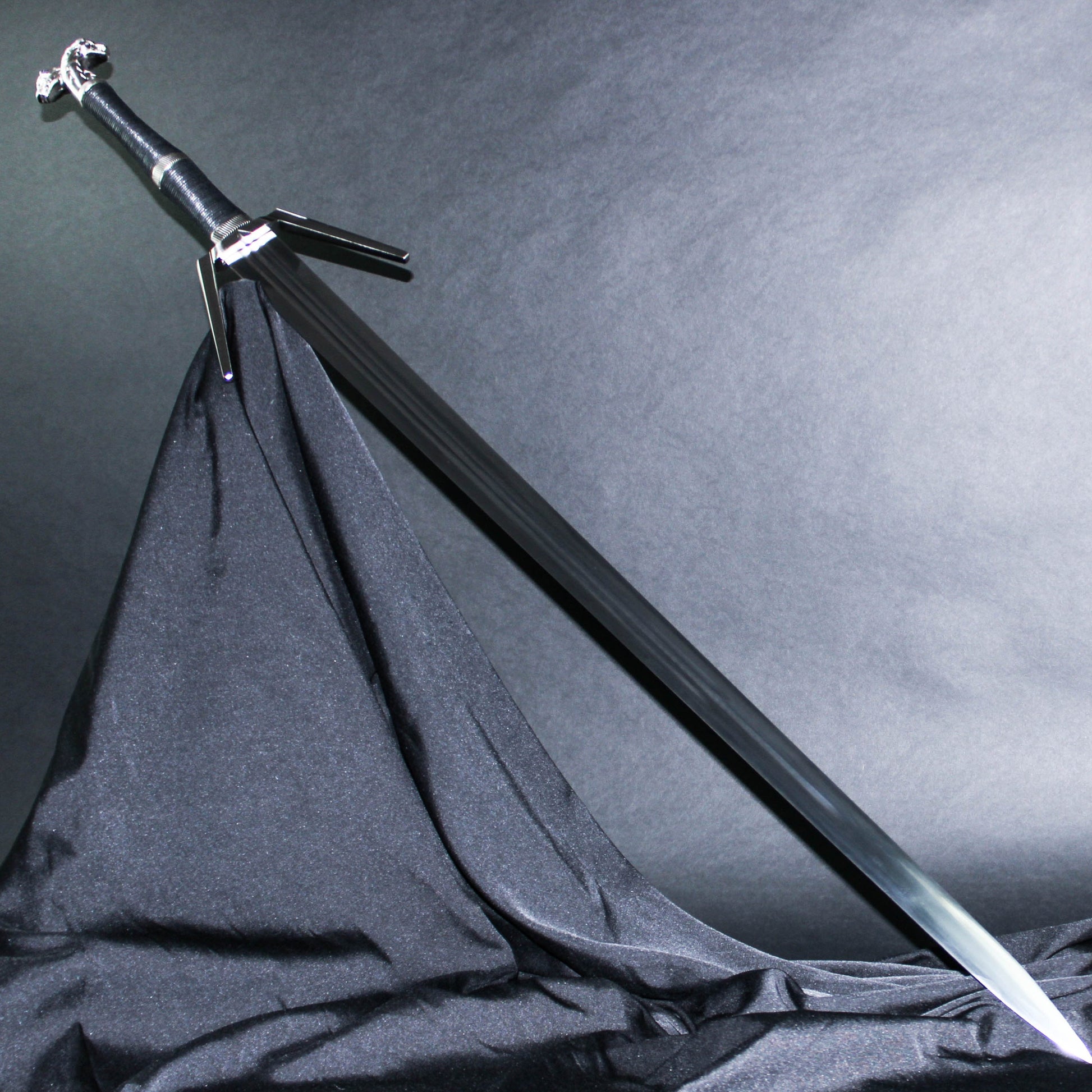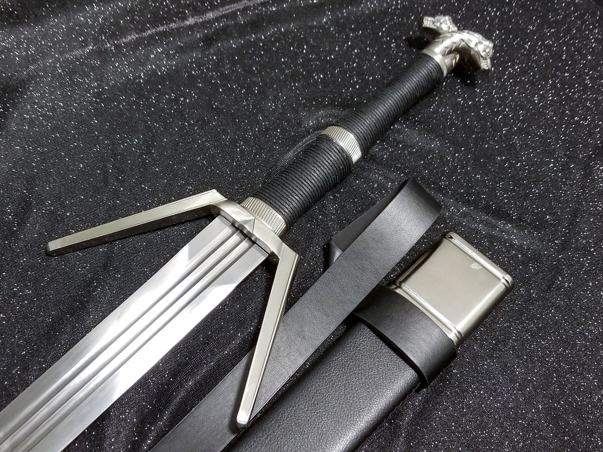 - Approx. 10.5 inch Leather Wrapped Hilt with weathered Witcher School of the Wolf Emblem