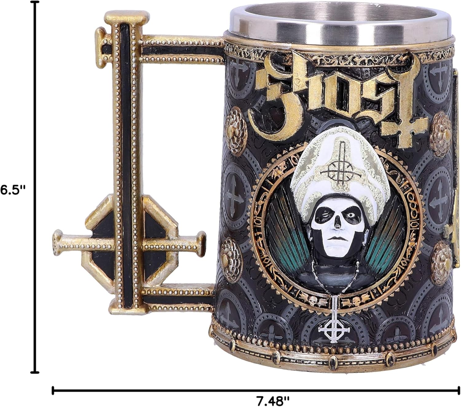 Channel the mystical energy of Ghost with the Nemesis Now Officially Licensed "Meliora" Gold Tankard. Inspired by the band’s iconic Meliora album, this tankard features intricate gold detailing and imagery that embodies the dark, theatrical essence of Ghost. Made from high-quality resin and finished with a golden hue, it's perfect for fans of the band or anyone who appreciates unique, Gothic drinkware. Whether you're raising a toast to Papa Emeritus or simply enjoying your favorite brew, this 20oz tankard brings a touch of Meliora magic to your collection.