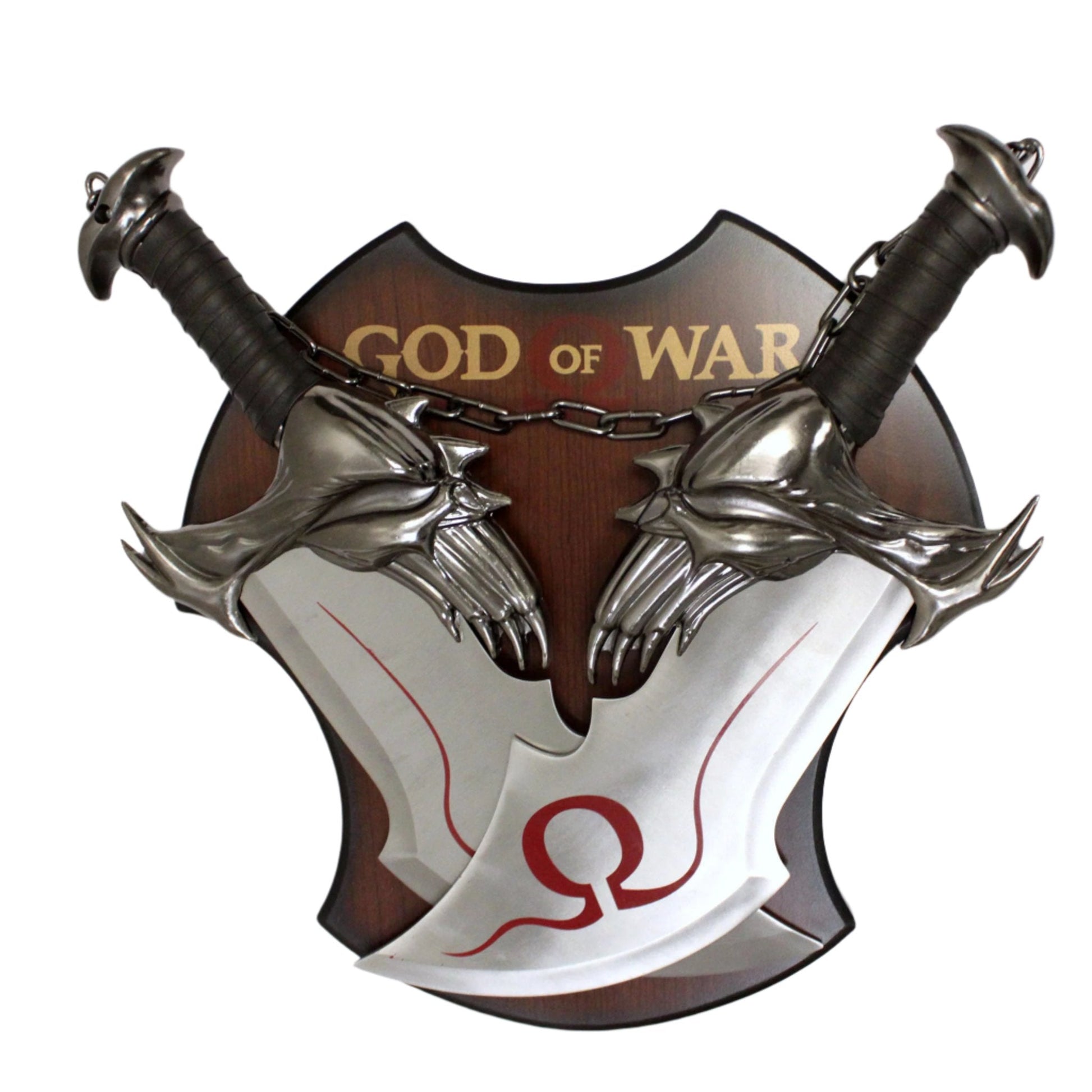 These heavy stainless steel display replicas bring the game mythos to life in your living room! Each unsharpened knife measures about 17 inches in length. The blades of chaos are presented chained together and include a wooden display plaque and optional mounting hardware.