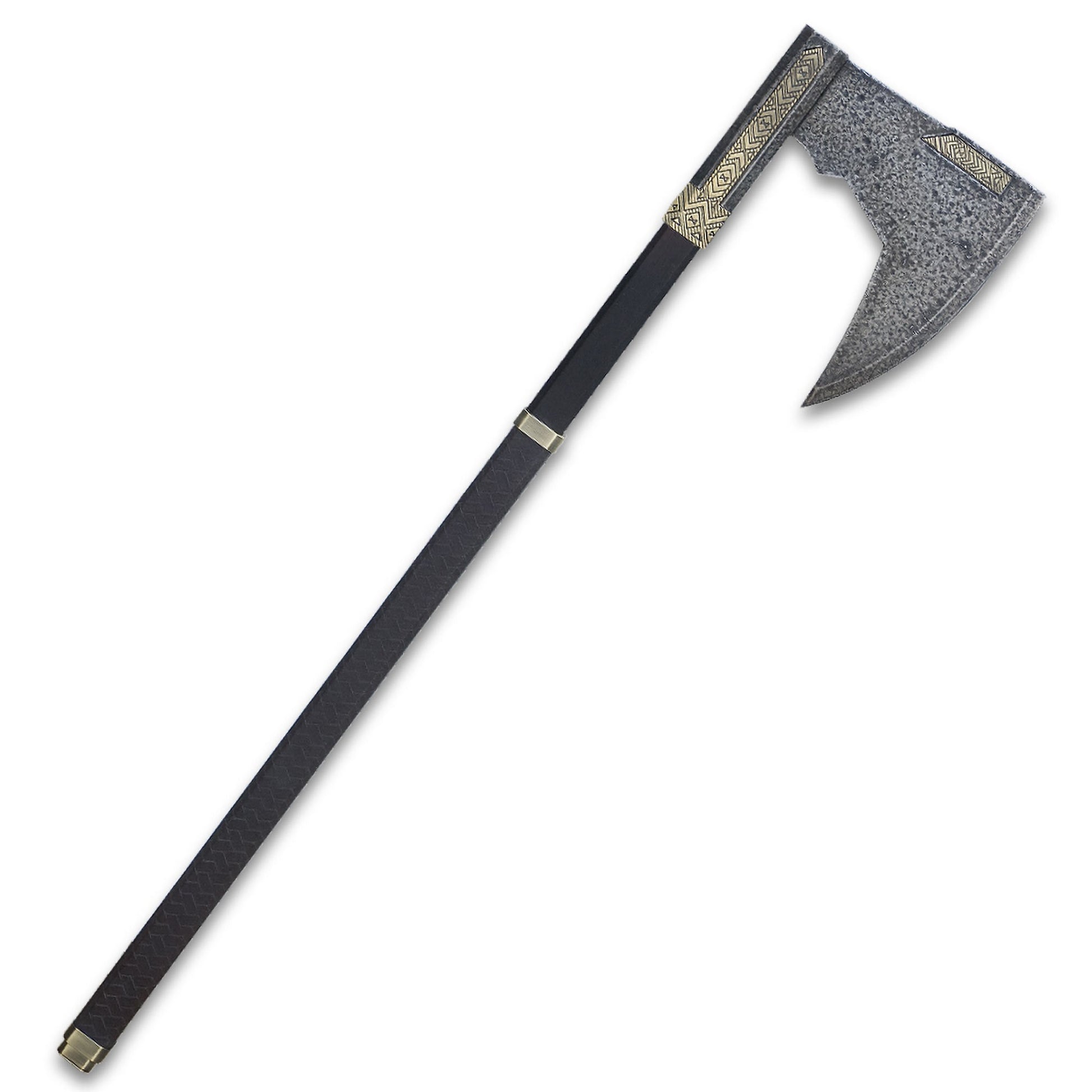 This authentically detailed axe is a reproduction of the prop featured in The Lord of the Rings Trilogy, presented by New Line Cinema. United Cutlery, the industry leaders in fine film prop reproductions, has meticulously recreated the actual filming prop. The blade is cast of forged tool steel with brass engraved decorations and a weathered steel finish giving it a battle worn appearance. The replica was created using the finest grade materials and craftmanship available. Close attention to detail is a priority in every hand selected piece. Each replica includes a custom display plaque and is marked with appropriate copyrights to ensure authenticity.