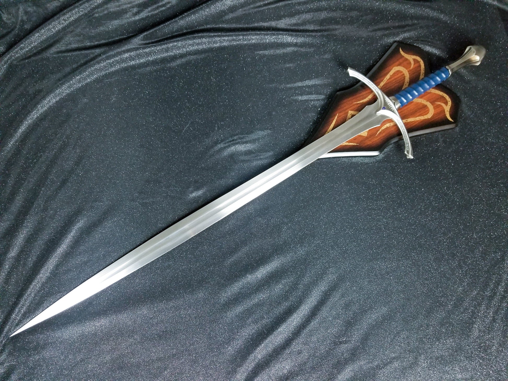 This beautiful, fully authorized recreation has been crafted to resemble Gandalf's sword as seen in the Lord of the Rings films. It features a solid metal guard and pommel, antique metal finish, and genuine leather-wrapped grip in the iconic saphire blue leather. A small blue gem and elven runes finish this recreation.