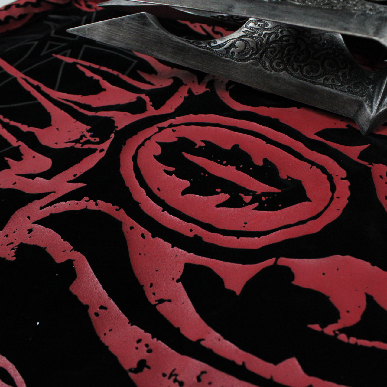 This special Red Eye edition Mordor prop replica display set includes Sauron's Mace, One Ring, and a 53" long cloth war banner featuring the red Eye Of Sauron.