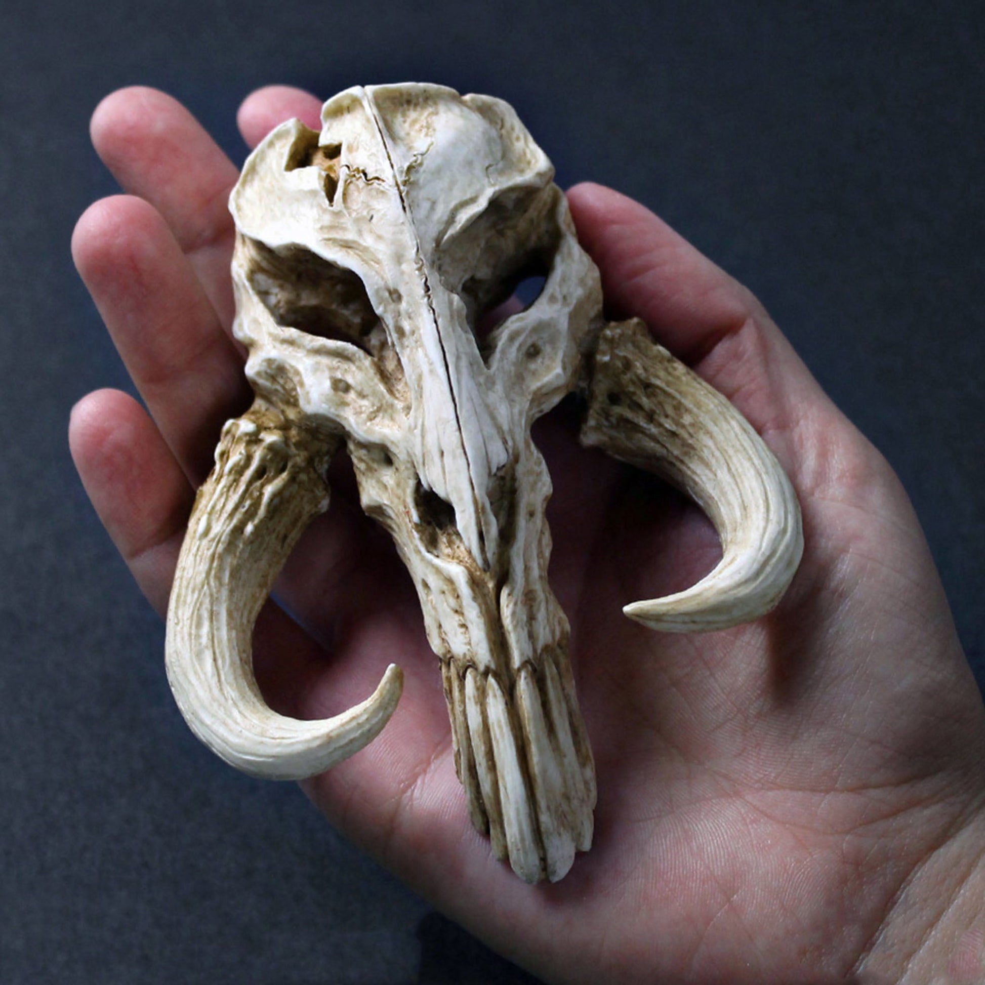The classic Mythosaur skull and Mandalorian symbol inspired this skull mini sculpture. It’s a wonderfully realistic interpretation of the mysterious skull marking seen on the armor of iconic bounty hunter, Boba Fett. The mini skulls are an eye-catching piece of artwork sure to bring a bit of the Star Wars universe to any home or office, desk or shelf. Each skull is made in the USA, hand painted, and comes ready to display safely packed in tissue paper.