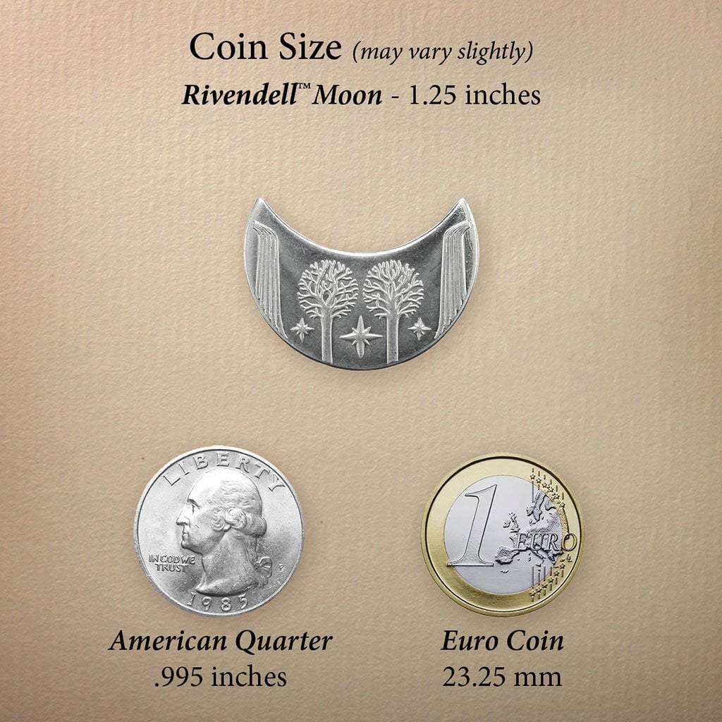 This Rivendell Moon is crafted in celebration of The Lord of the Rings by J. R. R. Tolkien is struck from .999 silver, measures 3.17 cm in diameter, and weighs about 6.3 grams. Crafted by Shire Post Mint. Coin artwork by Dylan Craig and Woody Maringer.