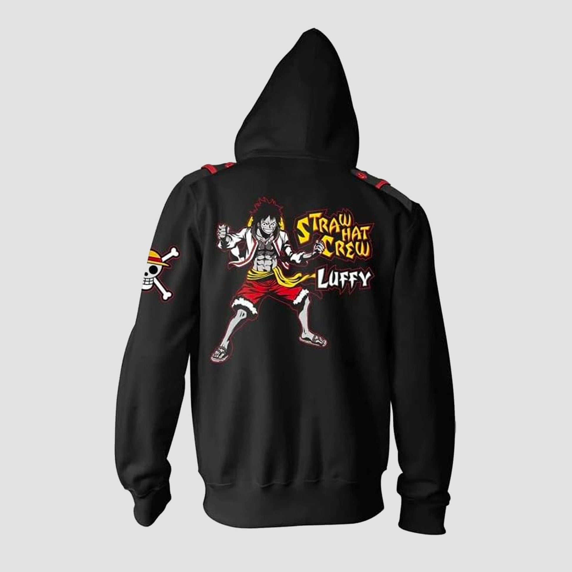 Join the Straw Hat Crew with this military-style hoodie inspired by Straw Hat-wearing captain himself, Monkey D. Luffy! This cozy zipper sweatshirt features incredible details including Luffy's name embroidered on the front, a Straw Hat Pirates patch on the sleeve, Luffy himself on the back, epaulettes, and soft fleece fabric with bright red accents.