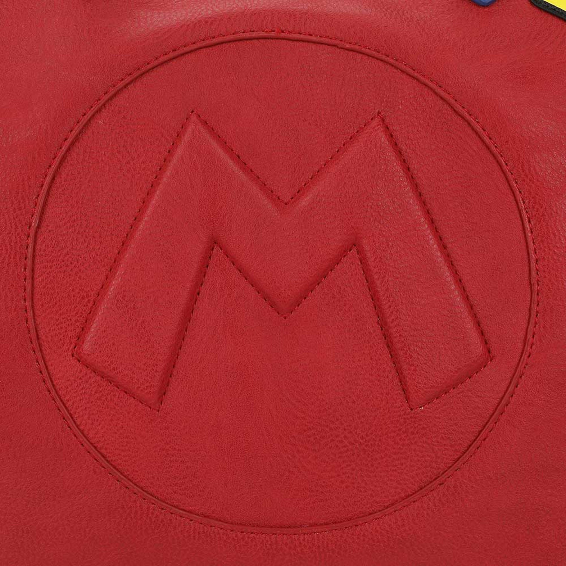 Tote your stuff around like one of the Super Mario Bros with this patch-covered tote bag! With colorful characters, items, and symbols from the game as sewn-on patches on embossed synthetic red leather with the iconic Mario "M", you'll have a stylish bag that'll take a hammering. It also features a tassel keychain with a metal coin turning this bag into a 1-UP for your style!