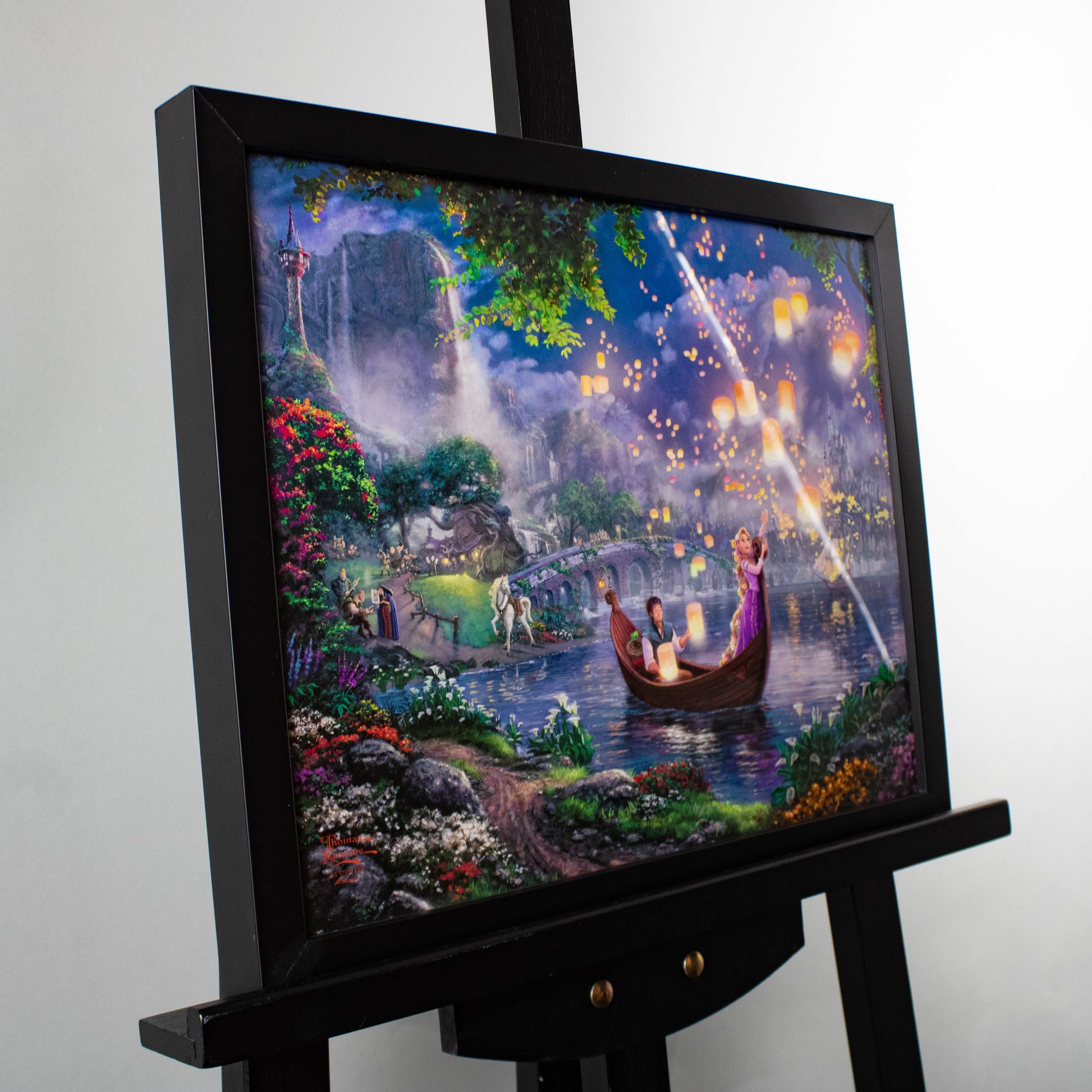 Tangled is a re-telling of the traditional fairy tale Rapunzel and joins other great titles as the 50th addition in the Walt Disney animated classic film series. It is with great pride then, that we at the Thomas Kinkade Studio have worked to fully realize the film’s message of following your dream. Tangled reflects a master work of light and romance. This panoramic portrayal captures the newfound love of Rapunzel and Flynn as they boat together on her 18th birthday. Many of the film’s unforgettable characters, including Maximus, Pascal and Mother Gothel, are seen on the lake shore. A thousand floating lanterns glow against the starlight of the night sky. Even the smallest light can fill a darkened room and love can indeed conquer all. We at the Thomas Kinkade Studios hope you enjoy Tangled.