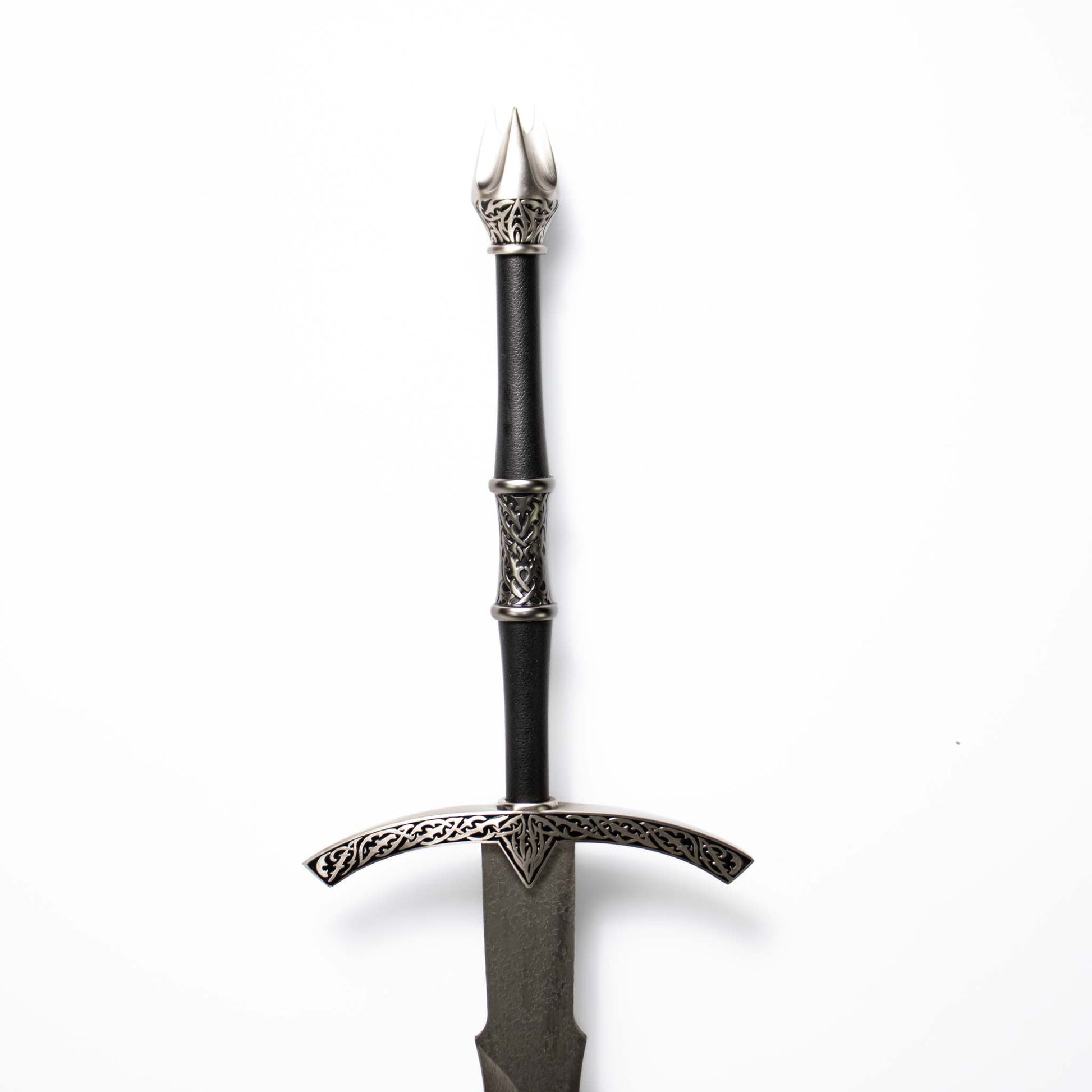 This evil and ancient sword is the Morgul Blade wielded by the Witch King of Angmar, leader of the nine Ringwraiths, the indestructible and relent-less shadow servants of Sauron. They were once mortal kings of men that Sauron corrupted with his Ring of Power. Also called Dark Riders or the Nazgul, they can sense when the One Ring is near and can see the Ringbearer clearly when he puts it on. The Witch King's sword was built by armourers of the dark land of Mordor, under the command of their evil master Sauron. 54-5/8" overall length. Tempered stainless steel blade with "aged" finish and leather-wrapped grip.
