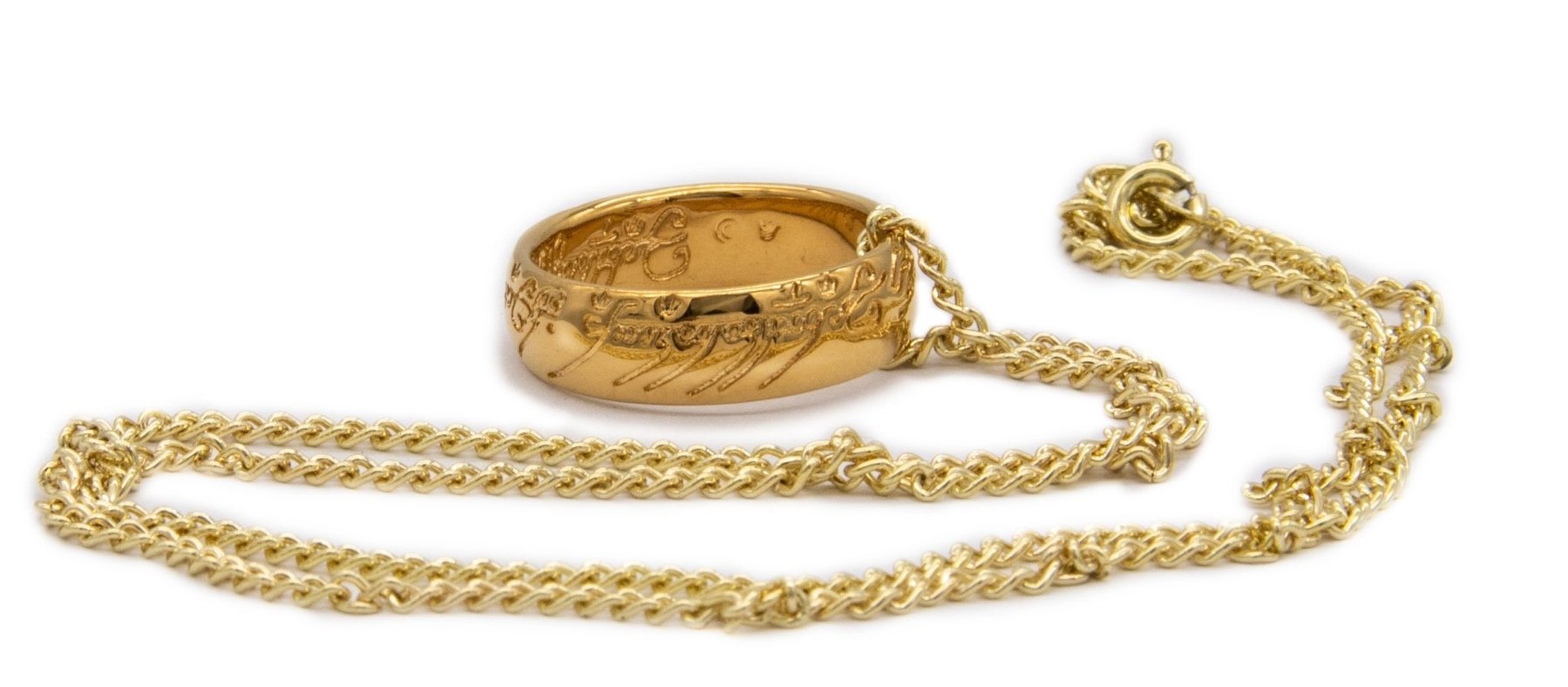The One Ring, also called The Ruling Ring and Isildur's Bane, is crafted in solid bronze by the Badali Jewelry artists and then barrel plated with pure 24k gold. Each One Ring pendant has the appearance of solid gold, hence the name, Gollum Gold. Our Gollum Gold One Ring appeared in an episode of The Big Bang Theory.